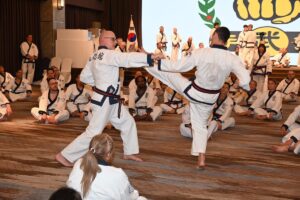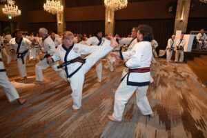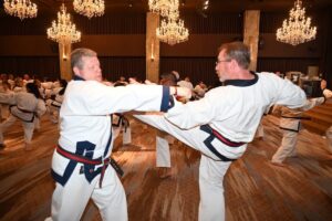 During the week of enduring training, all aspects of the art, including new principles and concepts are introduced to the candidates. All of the training is based on Moo Do principles handed down from the Founder, Hwang Kee, and those new principles that have been introduced by Kwan Jang Nim H. C. Hwang. Training is emphasized on Hyungs, Basic Ki Cho, and advanced training, history is reviewed and life as a Moo Do In is shared among the candidates, visiting members, and the senior leadership.