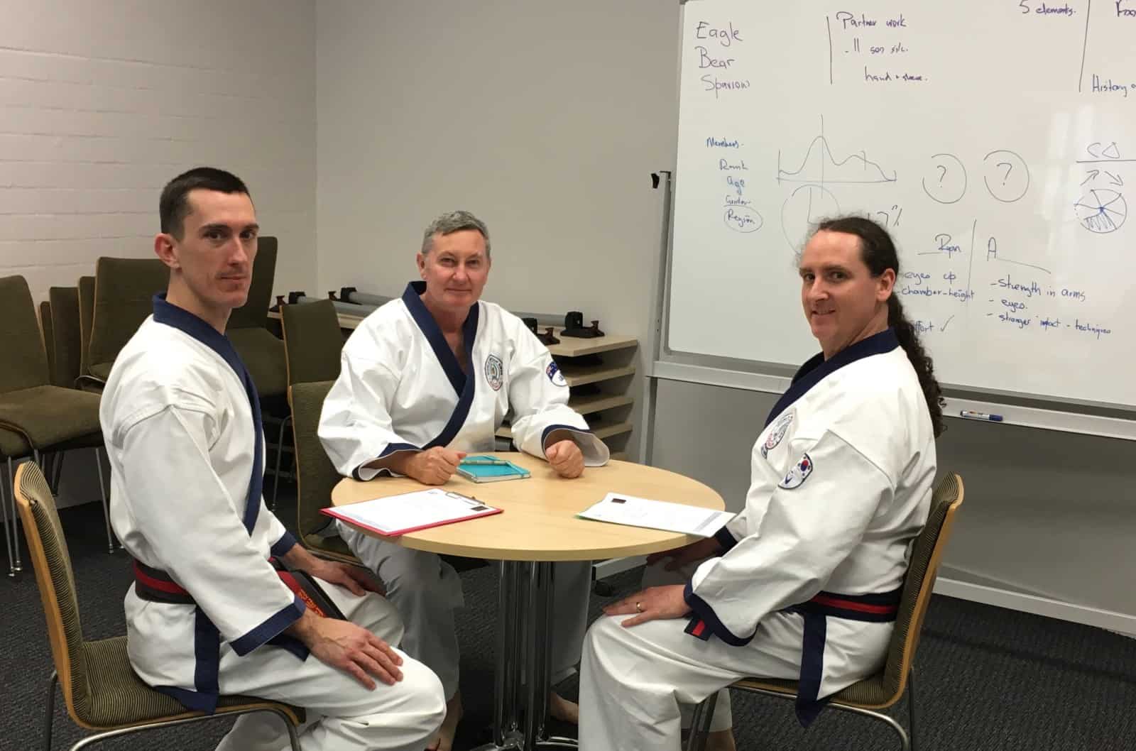 October 2017: Australian Designee Kriton Glenn SBN (centre) with the new Australian TAC members Kim Wyles SBN (left) and Mark Koina SBN (right), discussing the up-coming World Moo Duk Kwan Symposium, Youth Leadership, 2018 events and the transition of the Australian TAC to the next generation of leaders.