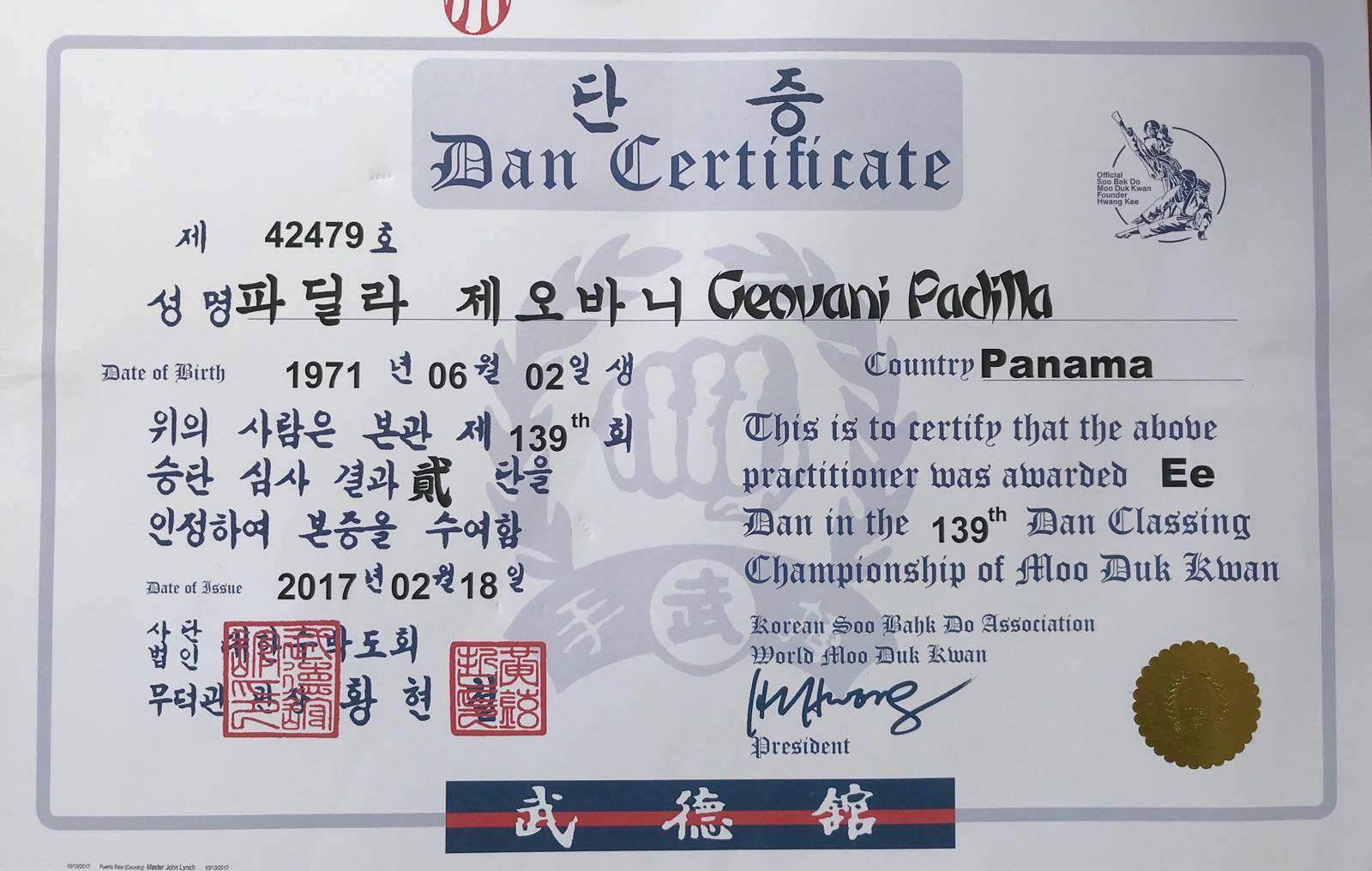 Geovanni Padilla had always dreamed of being under the guidance of Kwan Jang Nim H.C Hwang, even during the years he was under Vangas SBN. After I left Panama, in Dec 1989, Geovanni Padilla re-established contact with me and expressed his desire to join the World Moo Duk Kwan. Eventually, he was told to contact Oscar Rosado, Sa bom Nim #35372 from Puerto Rico, who volunteered to help Geovanni Padilla meet the requirements to be a dan member in the World Moo Duk Kwan, after several years of communication with the Puerto Rico team of Rosado SBN and Master Lynch #41637 , the team traveled to Puerto Rico for some training and to conduct a dan shim sa for Mr. Padilla. He was evaluated for Ee Dan and was successfully promoted in February of 2017.