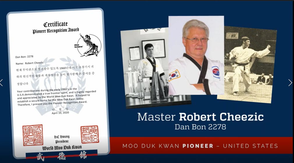 Master Cheezic was recently honored and recognized as an Early Pioneer of the Moo Duk Kwan Tang Soo Do®, by Kwan Jang Nim H.C. Hwang. He was also interviewed for the 75th Anniversary of the Moo Duk Kwan®, during the virtual celebration. Interview with Master Cheezic for the 75th Anniversary.